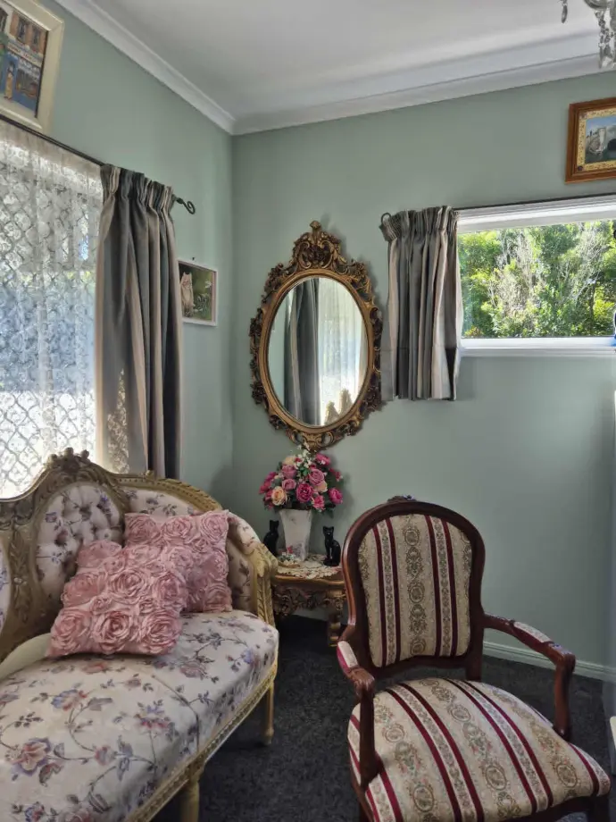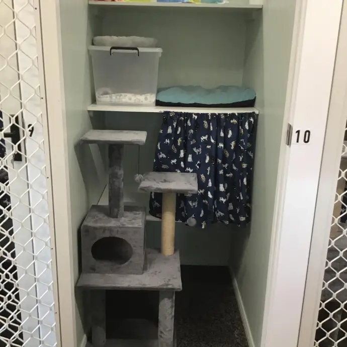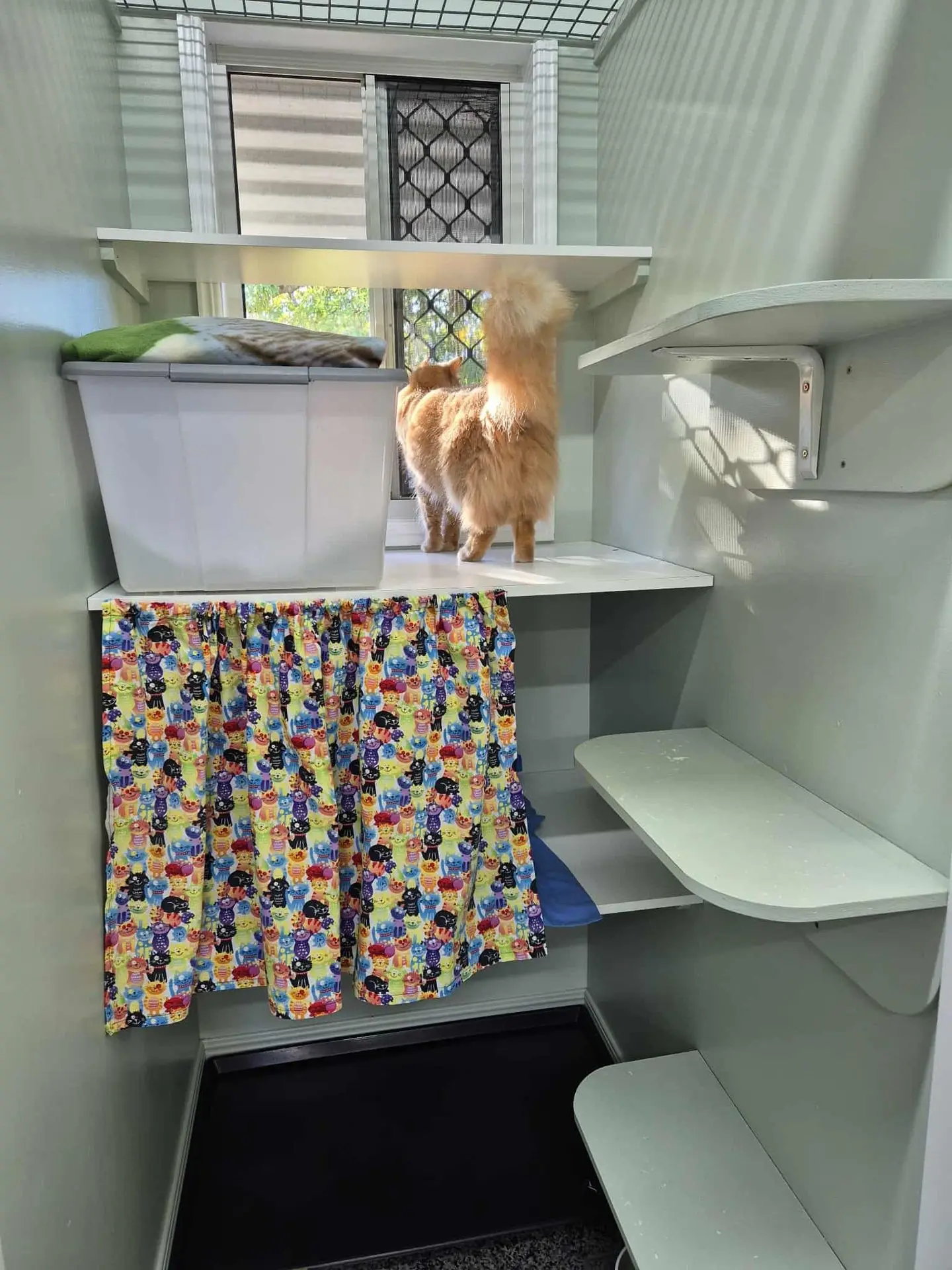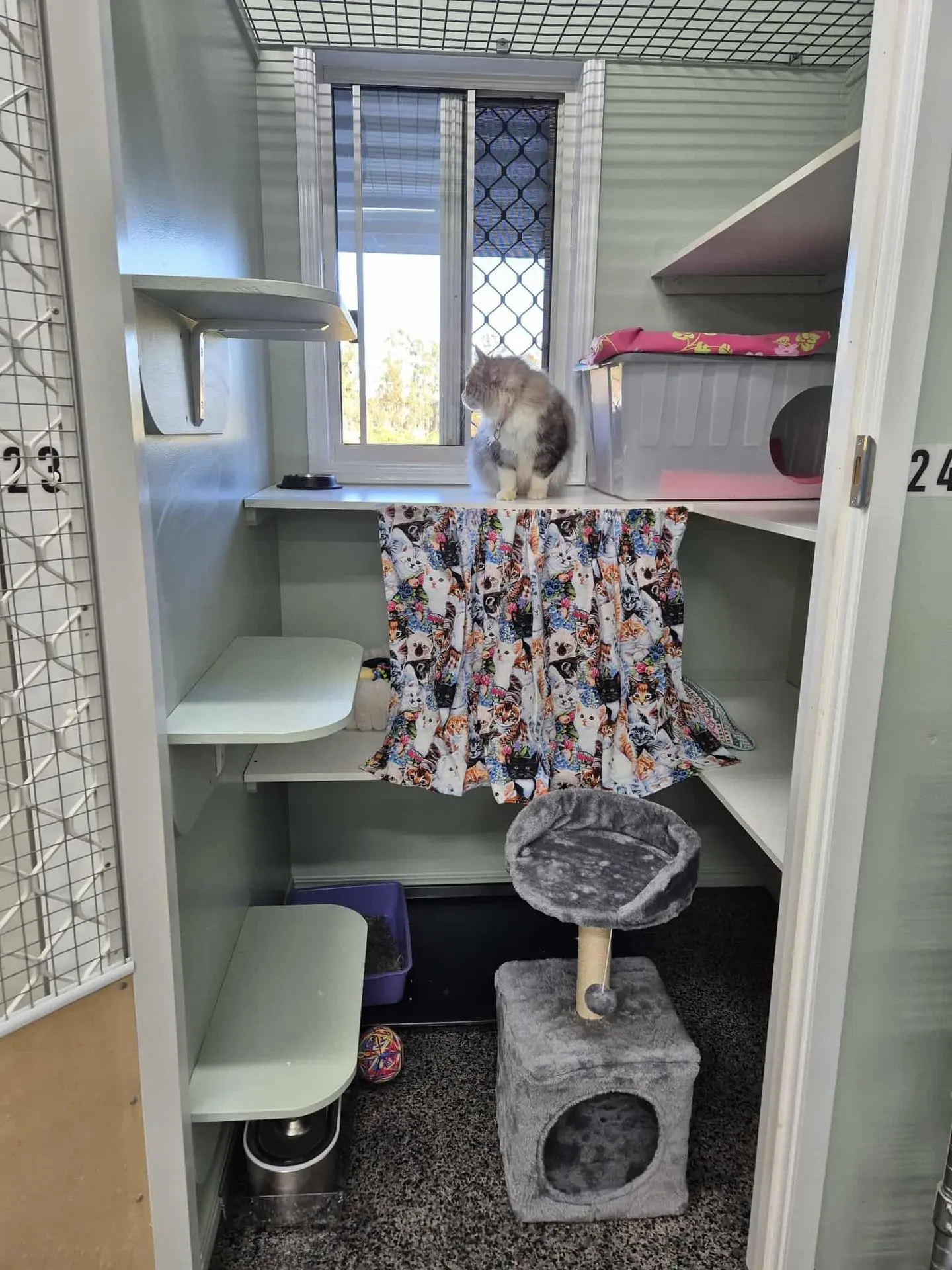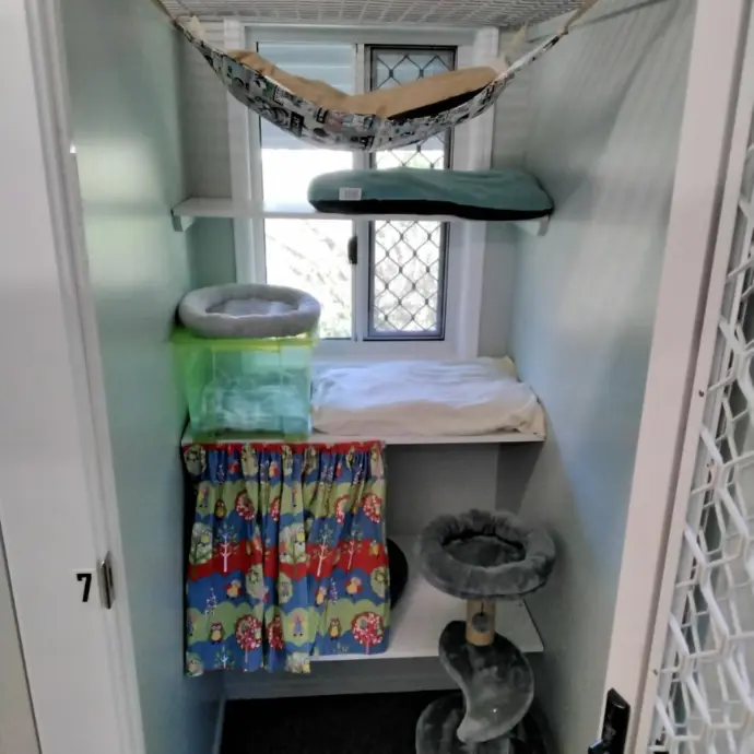 Lovely airy room with views over our gardens and plenty of bird action. The room has 3 generous shelves, a privacy curtain for those timid babies, a hidey hole and a scratching post. Plenty of soft, comfortable bedding supplied. Suitable for 1 or 2 cats.