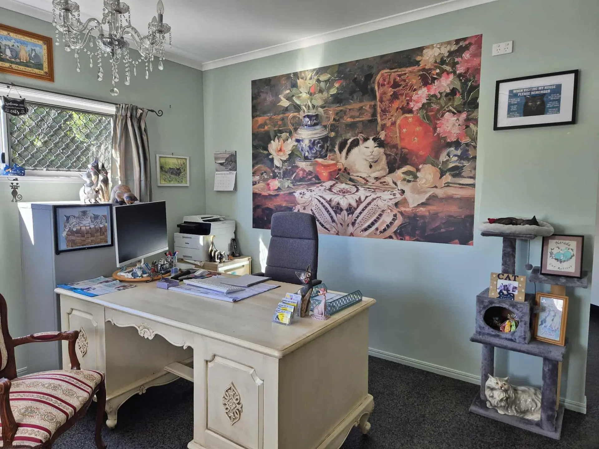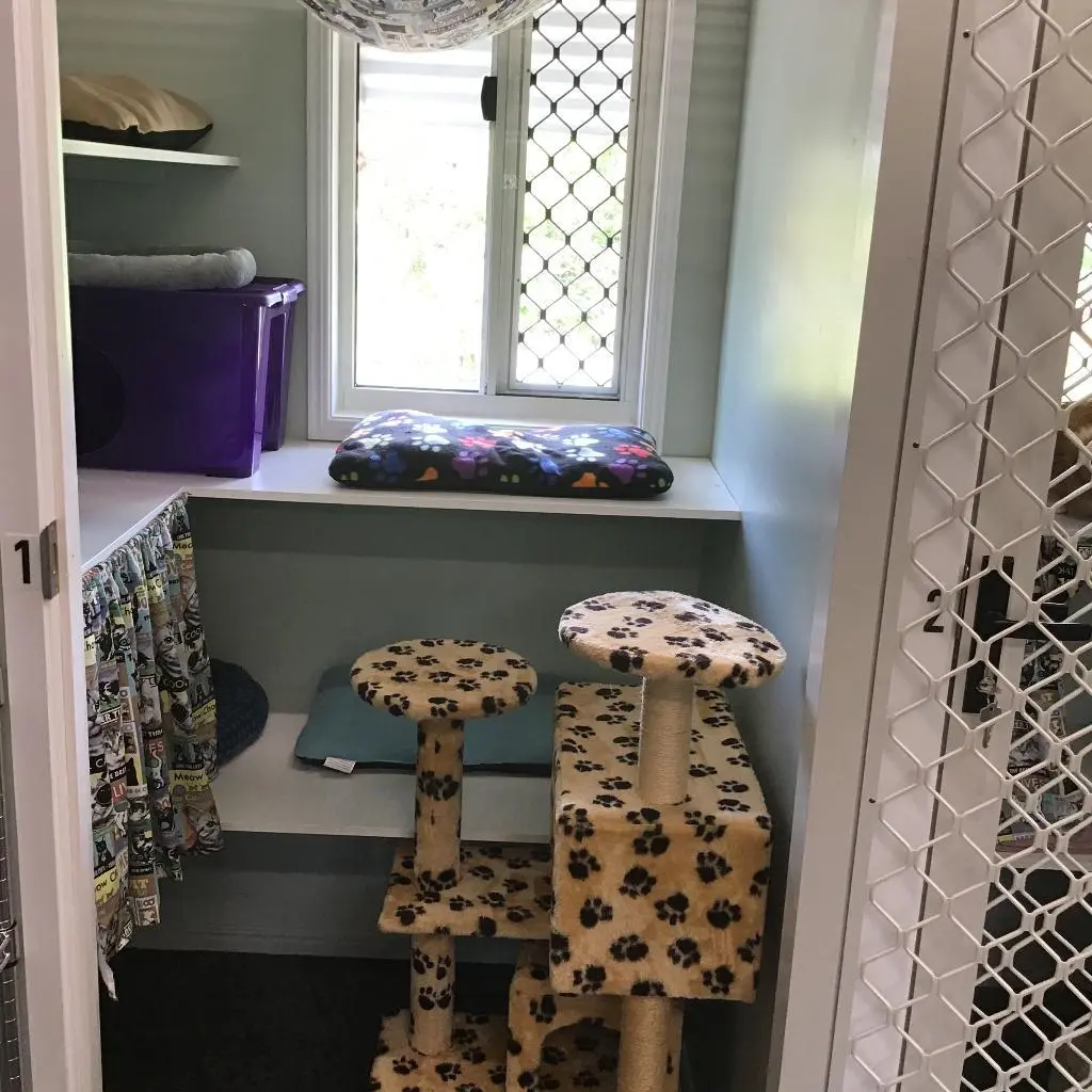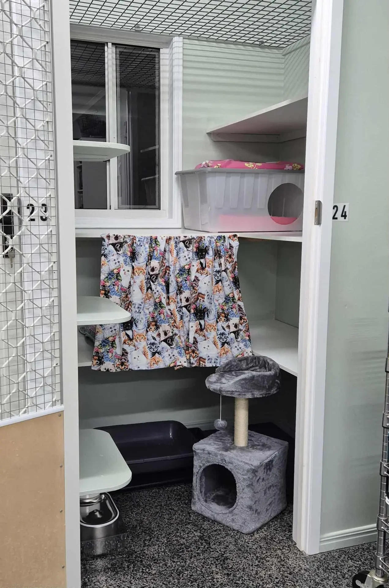 Lovely big airy room with views over our gardens and plenty of bird action. The room has multiple shelving, a privacy curtain for those timid babies, a hidey hole, hammock and a scratching post. Plenty of soft, comfortable bedding supplied. Suitable for 1 to 3 cats.
